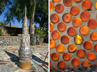 her colorful bottle buildings and off-the-wall trash sculptures.